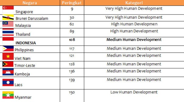 Salah satu indikator penting dari kondisi warga suatu negara adalah Indeks Pembangunan Manusia (IPM). Pada tahun 2014 IPM Indonesia adalah 68.4. Capaian ini menempatkan Indonesia pada peringkat 108 dunia. Di antara Negara-negara ASEAN Indonesia berada di bawah empat besar ASEAN dengan perbedaan yang lumayan jauh sebagaimana terlihat pada table di bawah ini: