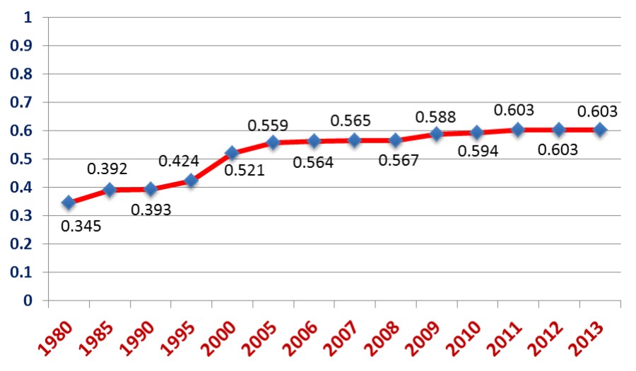 - Pada tahun 2013, capaian Index Pendidikan Indonesia adalah 0.603. Capaian ini sama dengan dengan capaian tahun sebelumnya. Bahkan, sesungguhnya capaian Index Pendidikan Indonesia relatif rata (flat) sejak beberapa tahun lalu sebagaimana tampak dari gambar di bawah ini: