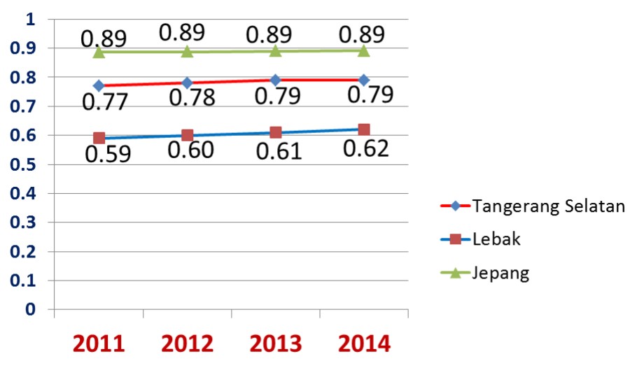 Perbedaan lebih dari 17 poin. Bila dilihat dari capian IPM ini, sudah sejak lama kualitas hidup anak-anak Kota Tangerang Selatan tampaknya lebih mirip dengan kualitas hidup anak-anak Jepang secara umum sebagaimana tampak dari tren capaian di bawah ini: