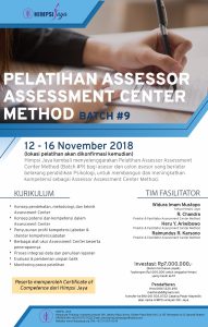 Himpsi Jaya kembali akan menyelenggarakan Pelatihan Assessor Assessment Center Method Batch #9 yang akan diselenggarakan pada tanggal 12-16 November 2018.